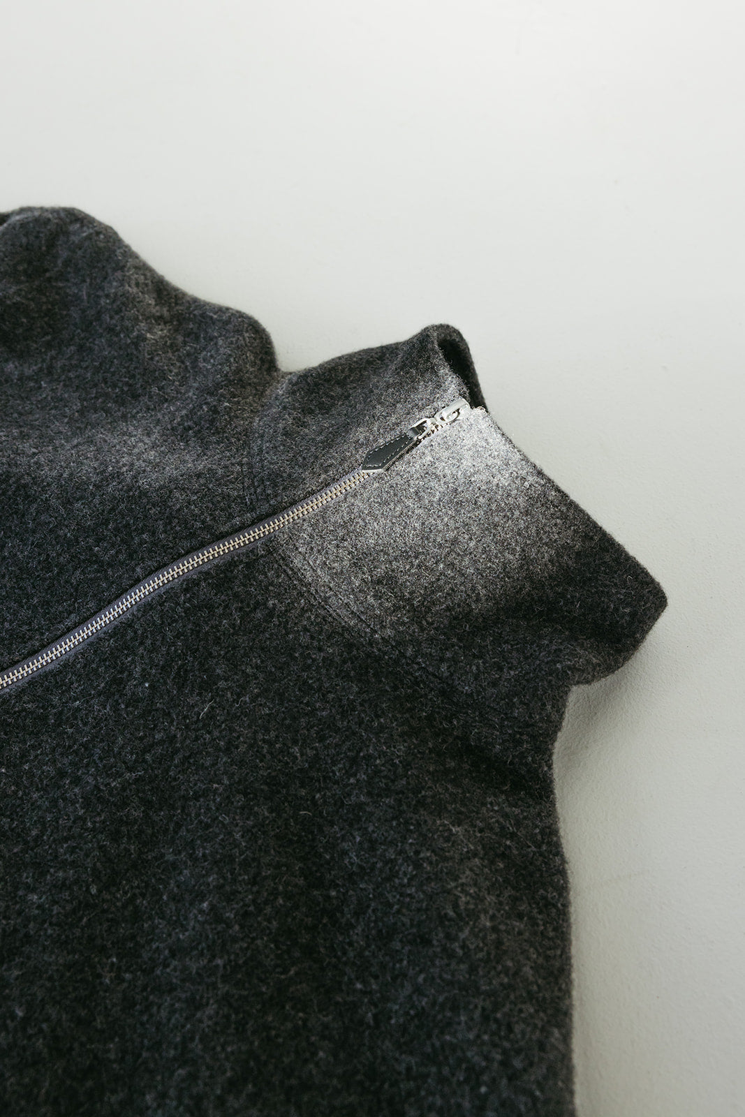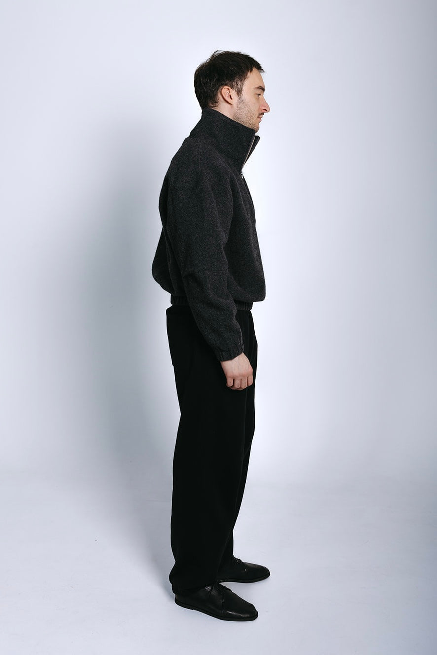 A modern reinterpretation of classic 1980s and 1990s fleece pullovers, crafted in a natural 100% wool fleece. Designed with a vintage-inspired wide and cropped fit, it features a high collar, YKK zipper with faux leather zipper pull, cinched cuffs and hem, and pleated elbow detailing for added structure and durability. Finished cleanly throughout, including bias-bound taping along the zipper seams.